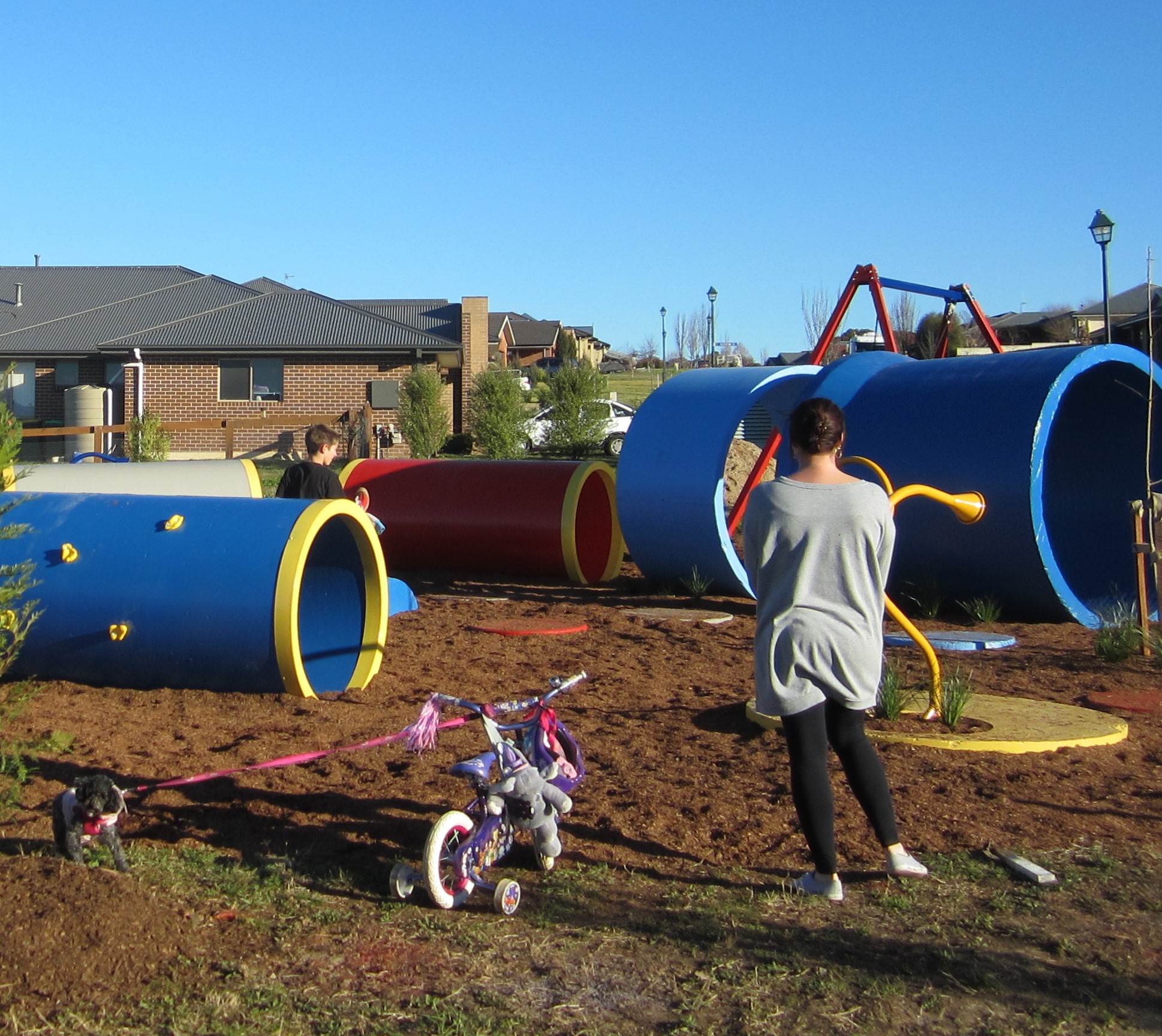 The play space includes an outer loop path, an inner tunnel circuit, a nest swing, talk-tubes, hopping steppers, trees and native grasses. A climbing net tunnel connects two smaller pipes that also have climbing hand-holds over them, for smaller children to use. Native rocks provide a contrast to the brightly painted finish of the concrete. Seats are included for carers under newly planted shade trees.